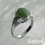 思い出の詰まったヒスイのリング。ヒスイのリングの台座が古くなってしまったので、丁寧に石だけをはずします。はずしたヒスイは、まだまだ色艶を失わず、美しい輝きを放っています。